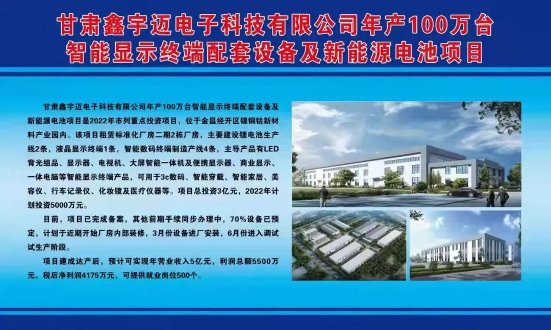 甘肃鑫宇迈电子科技有限公司年产100万台智能显示终端配套设备及新能源电池项目是2022年市列重点投资项目,位于金昌经开区镍铜钴新材料产业园内。该项目租赁标准化厂房二期2栋厂房,主要建设锂电池生产线2条,液晶显示终端1条,智能数码终端制造产线4条,主导产品有LED背光组品、显示器、电视机、大屏智能一体机及便携显示器、商业显示、一体电脑等智能显示终端产品,可用于3c数码、智能穿戴、智能家居、美容仪、行车记录仪、化妆镜及医疗仪器等。项目总投资3亿元,2022年计划投资5000万元。目前,项目已完成备案,其他前期手续同步办理中,70%设备已预定,计划于近期开始厂房内部装修,3月份设备进厂安装,6月份进入调试试生产阶段。