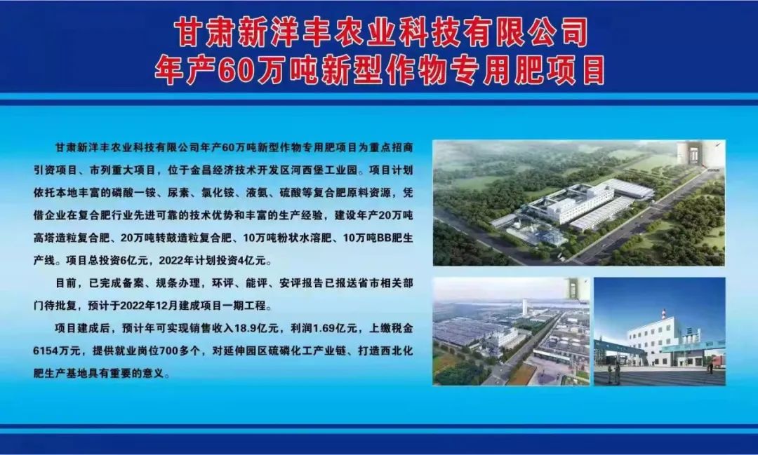 甘肃新洋丰农业科技有限公司年产60万吨新型作物专用肥项目为重点招商引资项目、市列重大项目,位于金昌经济技术开发区河西堡工业园。项目计划依托本地丰富的磷酸一铵、尿素、氯化铵、液氨、硫酸等复合肥原料资源,凭借企业在复合肥行业先进可靠的技术优势和丰富的生产经验,建设年产20万吨高塔造粒复合肥、20万吨转鼓造粒复合肥、10万吨粉状水溶肥、10万吨BB肥生产线。项目总投资6亿元,2022年计划投资4亿元。目前,已完成备案、规条办理,环评、能评、安评报告已报送省市相关部门待批复,预计于2022年12月建成项目一期工程。