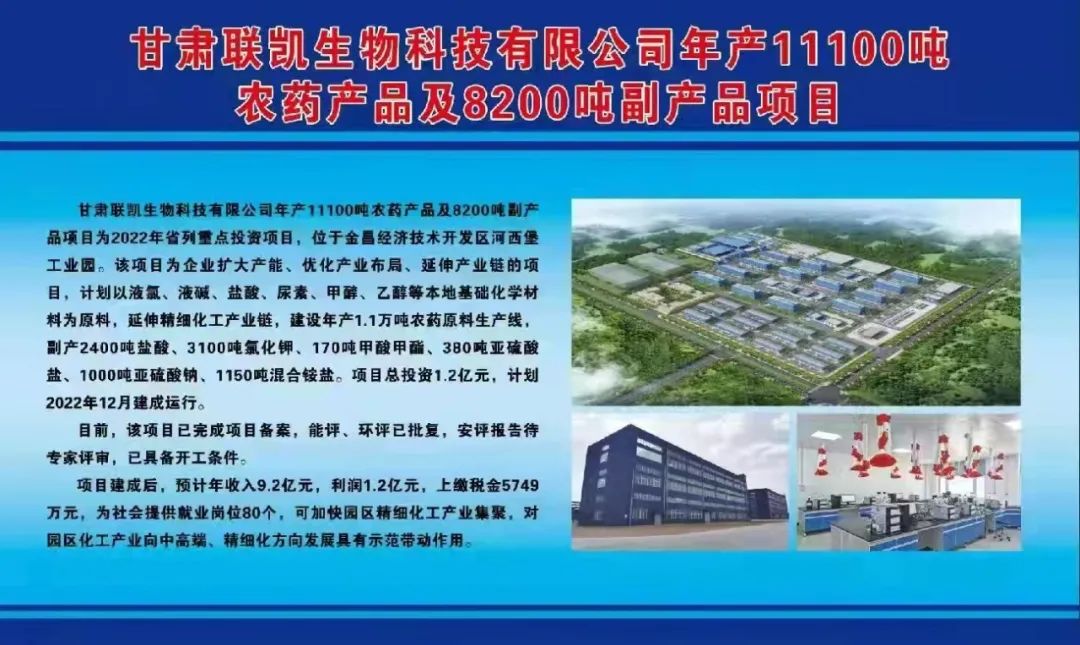 甘肃联凯生物科技有限公司年产11100吨农药产品及8200吨副产品项目为2022年省列重点投资项目,位于金昌经济技术开发区河西堡工业园。该项目为企业扩大产能、优化产业布局、延伸产业链的项目,计划以液氯、液碱、盐酸、尿素、甲醇、乙醇等本地基础化学材料为原料,延伸精细化工产业链,建设年产1.1万吨农药原料生产线,副产2400吨盐酸、3100吨氯化钾、170吨甲酸甲酯、380吨亚硫酸盐、1000吨亚硫酸钠、1150吨混合铵盐。项目总投资1.2亿元,计划2022年12月建成运行。目前,该项目已完成项目备案,能评、环评已批复,安评报告待专家评审,已具备开工条件。