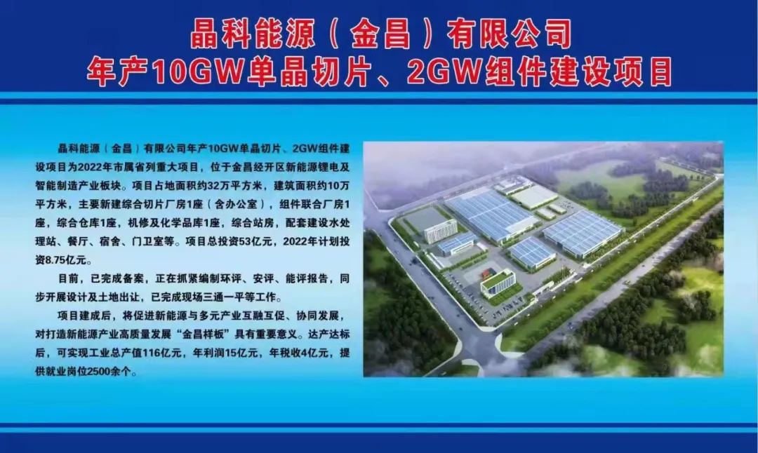 晶科能源(金昌)有限公司年产10GW单晶切片、2GW组件建设项目为2022年市属省列重大项目,位于金昌经开区新能源锂电及智能制造产业板块。项目占地面积约32万平方米,建筑面积约10万平方米,主要新建综合切片厂房1座(含办公室),组件联合厂房1座,综合仓库1座,机修及化学品库1座,综合站房,配套建设水处理站、餐厅、宿舍、门卫室等。项目总投资53亿元,2022年计划投资8.75亿元。目前,已完成备案,正在抓紧编制环评、安评、能评报告,同步开展设计及土地出让,已完成现场三通一平等工作。