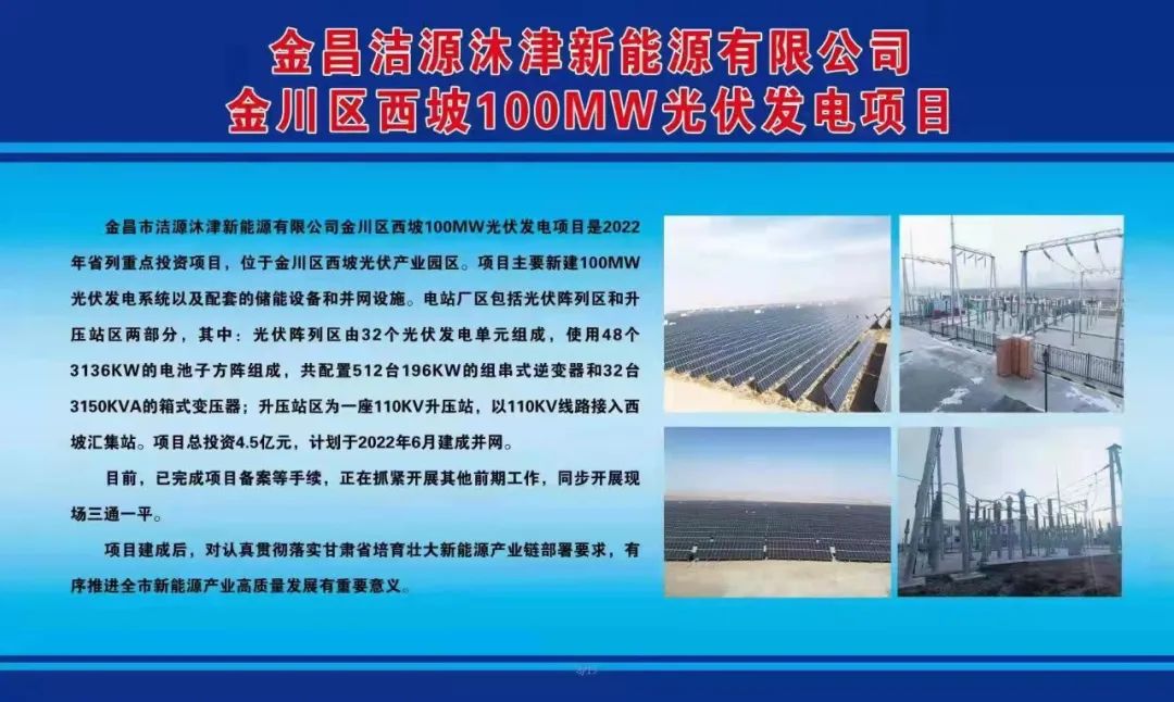 金昌市洁源沐津新能源有限公司金川区西坡100MW光伏发电项目是2022年省列重点投资项目,位于金川区西坡光伏产业园区。项目主要新建100MW光伏发电系统以及配套的储能设备和并网设施。电站厂区包括光伏阵列区和升压站区两部分,其中:光伏阵列区由32个光伏发电单元组成,使用48个3136KW的电池子方阵组成,共配置512台196KW的组串式逆变器和32台3150KVA的箱式变压器;升压站区为一座110KV升压站,以110KV线路接入西坡汇集站。项目总投资4.5亿元,计划于2022年6月建成并网。目前,已完成项目备案等手续,正在抓紧开展其他前期工作,同步开展现场三通一平。