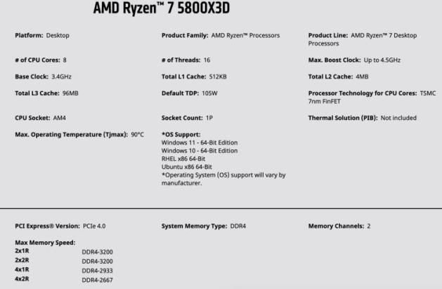 现在,AMD 官网已经公布了 R7 5800X3D 的参数:
