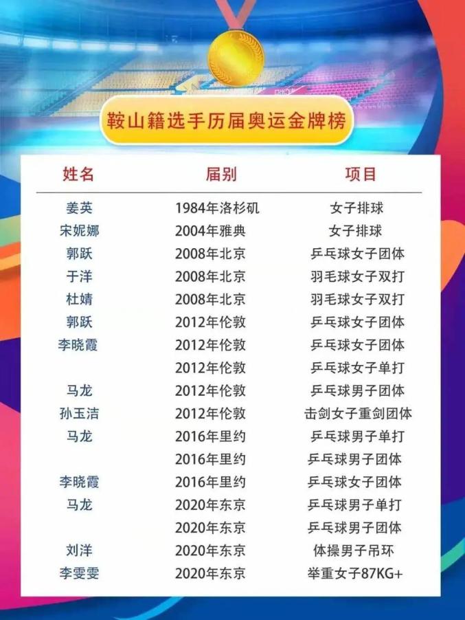 自1984年洛杉矶夏季奥运会至本届北京冬奥会,鞍山已经走出了姜英、宋妮娜、郭跃、李晓霞、马龙、于洋、杜婧、孙玉洁、刘洋、李雯雯、徐梦桃11位奥运冠军,共夺得16枚奥运金牌,是中国地市级城市中获得奥运金牌数最多的城市,并成为继哈尔滨、北京等城市之后为数不多的既有夏季奥运冠军又有冬季奥运冠军的“双奥”冠军之城。鞍山选手获得的奥运金牌数不仅数量多,而且含金量极高。其中,马龙是世界乒坛史上第一位男子双满贯、全满贯得主,是中国历史上夺得奥运金牌最多的运动员。徐梦桃是中国首位冬奥会自由式滑雪女子空中技巧项目冠军,她也是世界上第一位空中技巧的大满贯得主。