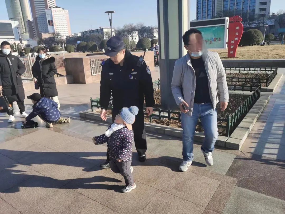 2月19日,历下公安分局特巡警大队一中队正在泉城广场巡逻,突然一位群众急匆匆地跑来,称自己两岁的儿子小辉(化名)在泉城广场喷泉西侧玩耍时不慎走丢,希望寻求民警帮助。