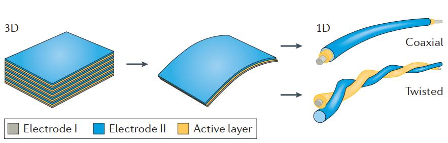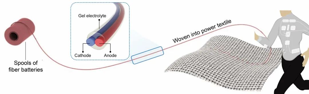 一个有效的策略是把电池制造成柔性纤维状。这类一维的、直径介于几十微米到几百微米的纤维电池可以适应各种形变,能够在与人体紧密接触的情况下稳定运行,还可以进一步将此类纤维电池编织为透气的纺织品,作为柔性供能平台与各类电子器件如可穿戴器件相集成,匹配各种需求。