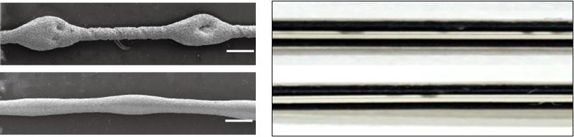 通过传统涂覆法制备的纤维电池电极(左)表面均匀性较差,通过溶液“纺丝”法制备的纤维电池(右)各功能组分均匀分布 | 参考文献[1]