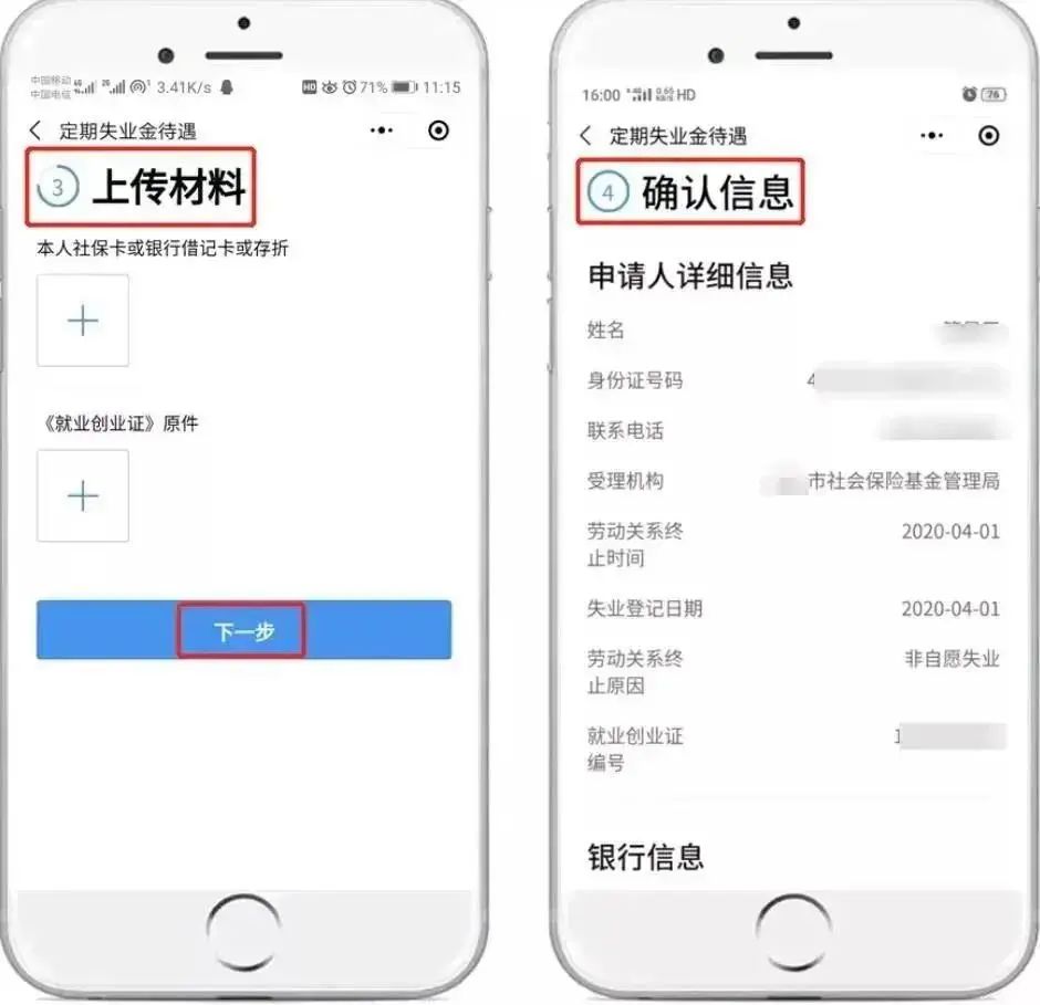 5、校验通过,进入填写信息页面,系统通过数据比对自动获取联系电话、劳动关系终止原因、银行账户等信息。