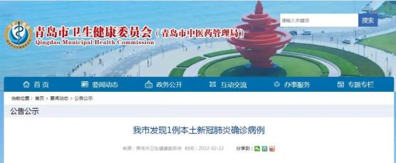 2022年2月22日,青岛市发现1例本土新冠肺炎确诊病例。