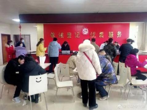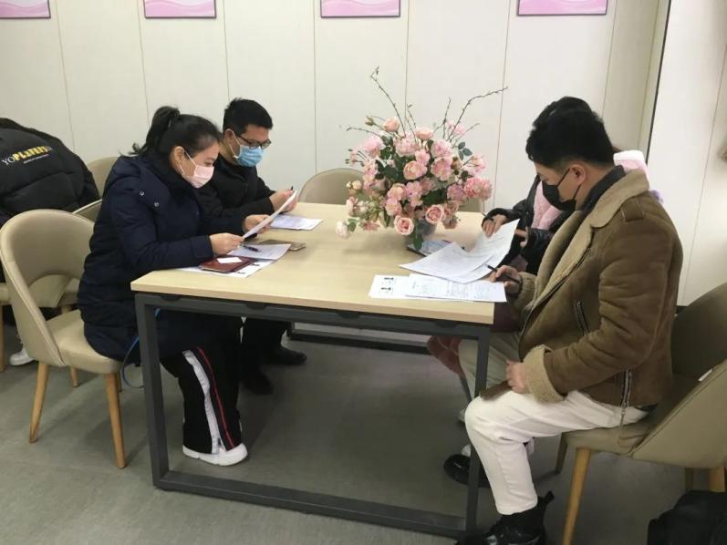 截止到2022年2月22日下午13时30分,万年县民政局婚姻登记处共成功为100对新人预约办理结婚登记,并承诺当天下午下班前会为这100队新人完成结婚登记手续。