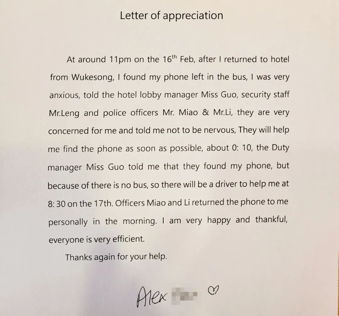 令我没想到的是,事主特意送来了一封英文的感谢信。人与人之间的友善不分国界,有些事情虽小,但足以暖人心。