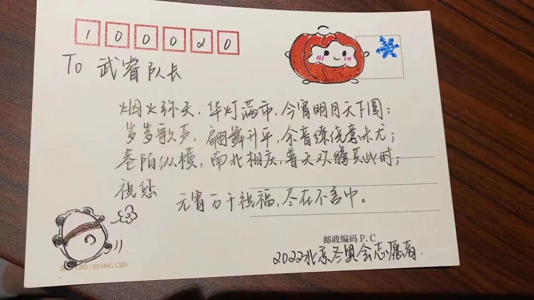 虎年元宵节当天,正在开展闭环安保工作的我收到了一张特别的节日贺卡。说它特别,因为这是这些天来和我一起执勤的志愿者亲手绘制的。“今宵明月天下圆,余音缭绕意未尤”,志愿者们用充满诗意的文字为我送上节日的祝福,让我的心瞬间就被温暖和感动所笼罩。素未相识,相聚在此,我们身份不同,职责不同,却有着共同的目标——守护我们的冬奥会圆满顺利举办!