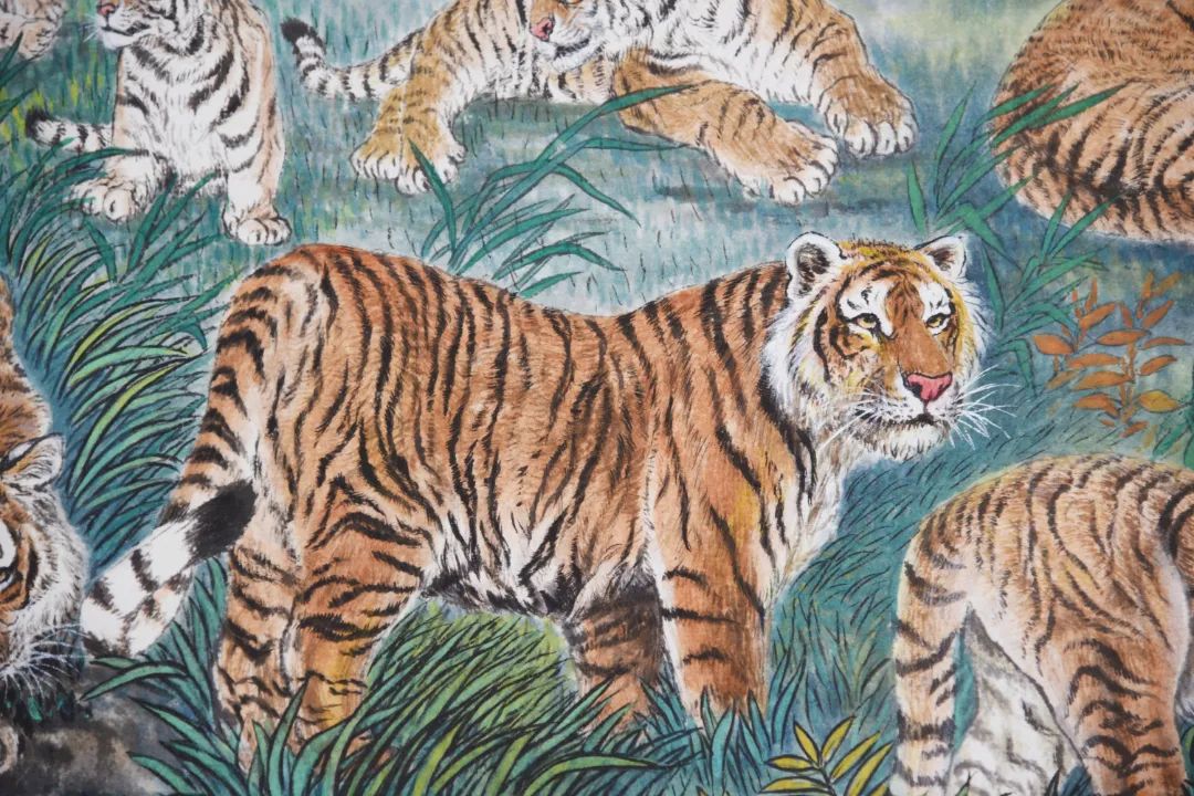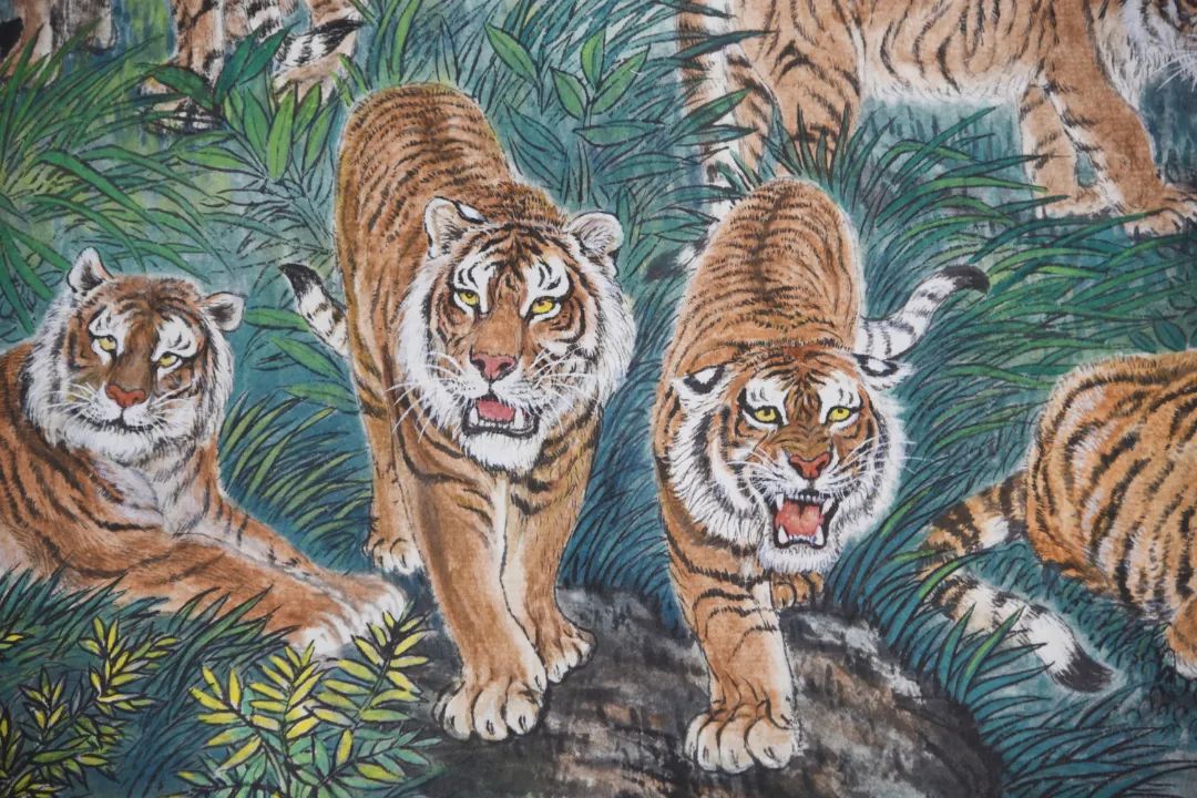 拉开画卷,一幅群虎盘踞图徐徐展开。身姿矫健的下山虎、昂首顾盼的卧虎、依偎成对的母子虎……100只老虎或戏水于溪涧,或奔走于山林,神情姿态各不相同,令人不由惊叹。