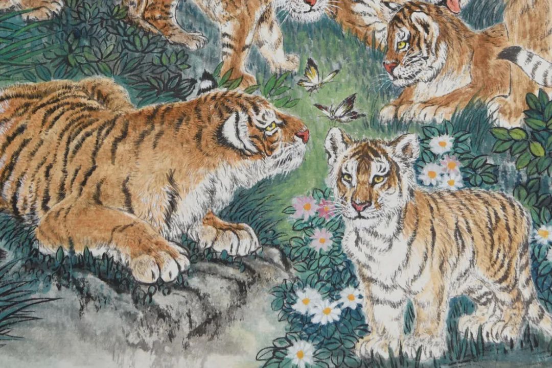 封仲华表示,虎被尊为“百兽之王”,在艺术作品中常以威严的形象出现,“但虎并非只有大家印象中凶猛的一面。”画中的一对母子虎引人注意,只见幼虎在丛中嗅花戏蝶,憨态可掬,母虎则卧其身旁温情地注视着它。“我在《百虎图》中画了许多‘柔情之虎’,它们也是有情义的动物。”封仲华说。
