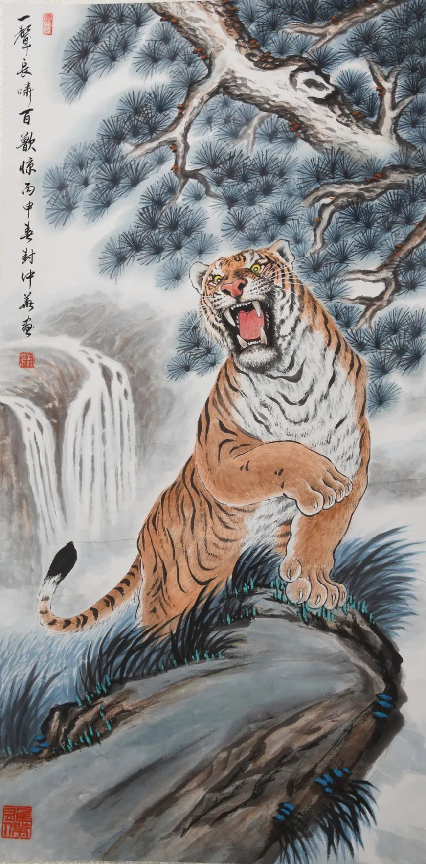 这幅长约5米的《百虎图》出自封仲华老先生之手,寓意虎年万象更新,生活千姿百态。封仲华以工笔和写意的技法,将身处松石、山林、流水等各场景种的老虎巧妙融合在一起,虚实相生、浑然天成。徜徉于画卷中移步换景,耳边似乎能听到林间虎啸。