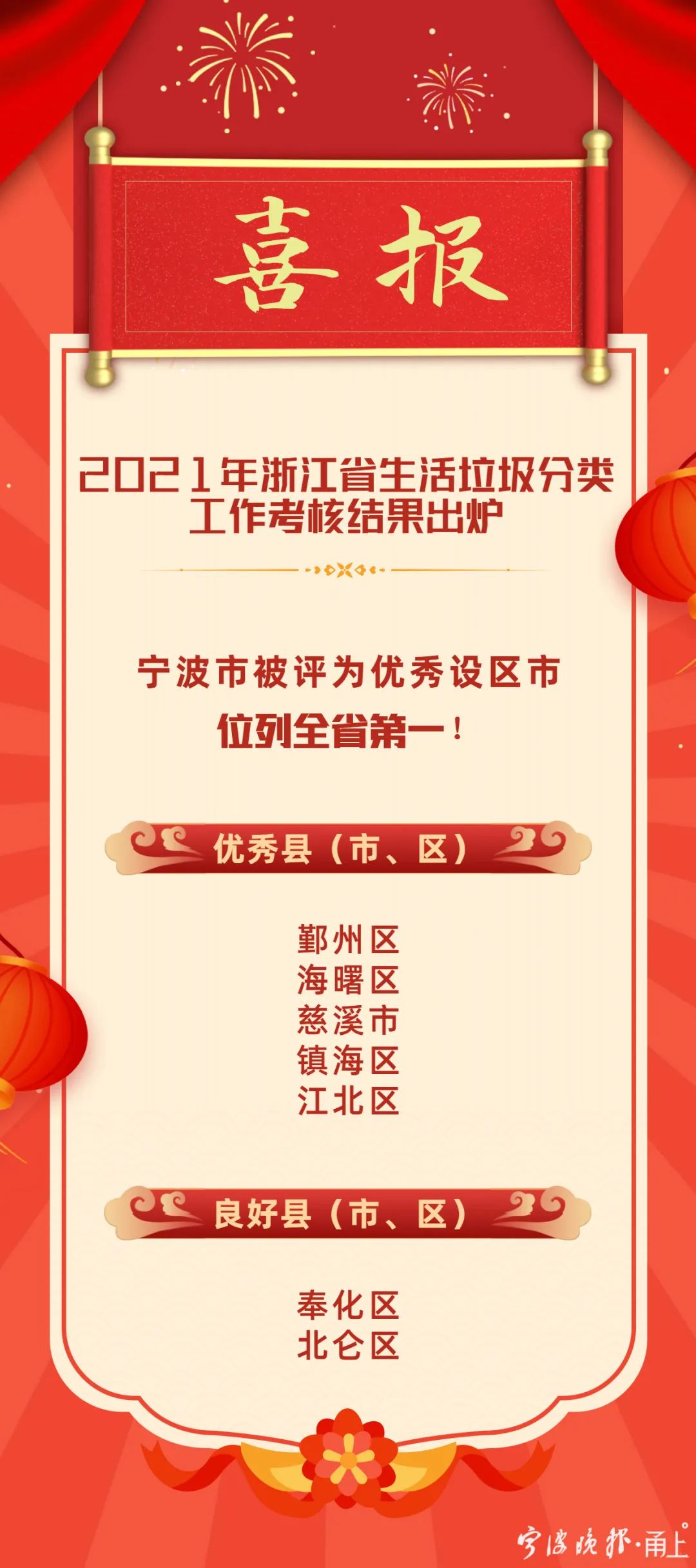日前,浙江省生活垃圾分类工作领导小组发布了《2021年度全省生活垃圾分类工作考核评估结果的通报》,宁波市列设区市第一名,同时鄞州区、海曙区、慈溪市、镇海区、江北区被评为优秀县(市、区),奉化区和北仑区被评为良好县(市、区)。