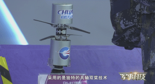 其实它是彩虹-817微型攻击无人机,它跟我们常见的无人机完全不一样。彩虹-817采用的是独特的共轴双桨技术,内部只有一个电机,通过传动机构带动上下两组旋翼。但两组旋翼转动方向是相反的,用以抵消旋翼的反扭力,以达到稳定的效果,也正是这一技术让它飞起来更像是竹蜻蜓。