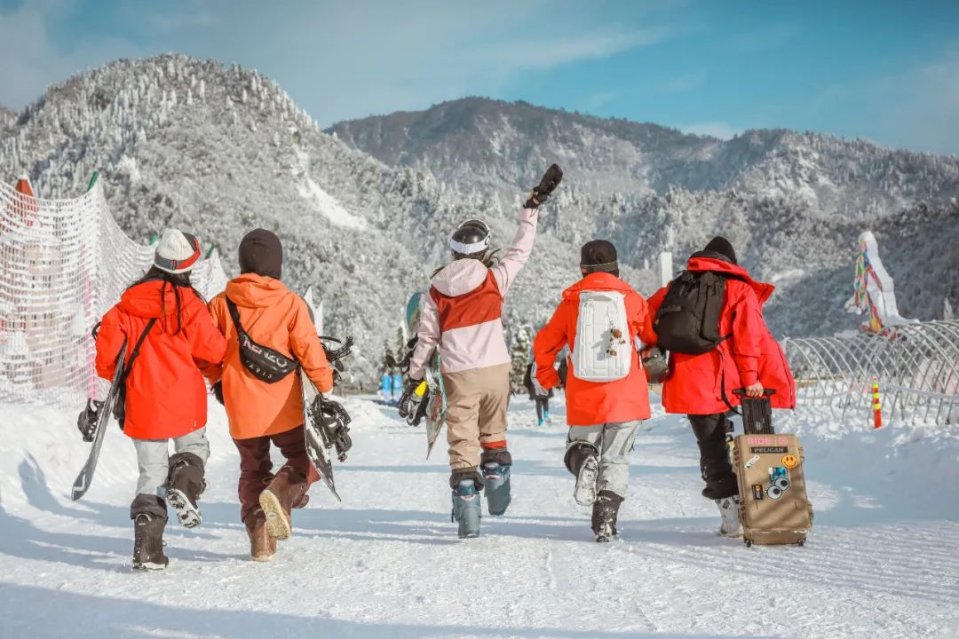 四川西岭雪山景区游客兴致高昂地走向滑雪场
