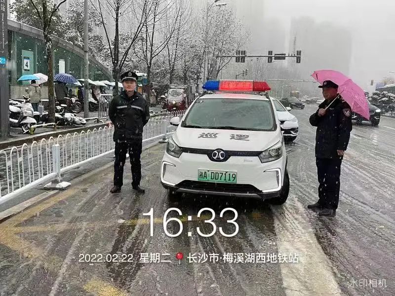 2月22日,天降大雪导致黄桥大道以及岳宁大道道路积雪严重。为保障人民群众安全,确保道路畅通,岳麓交警大队突击中队中队长刘杰带队检查道路情况,并巡逻防控,疏导车辆,预防事故。