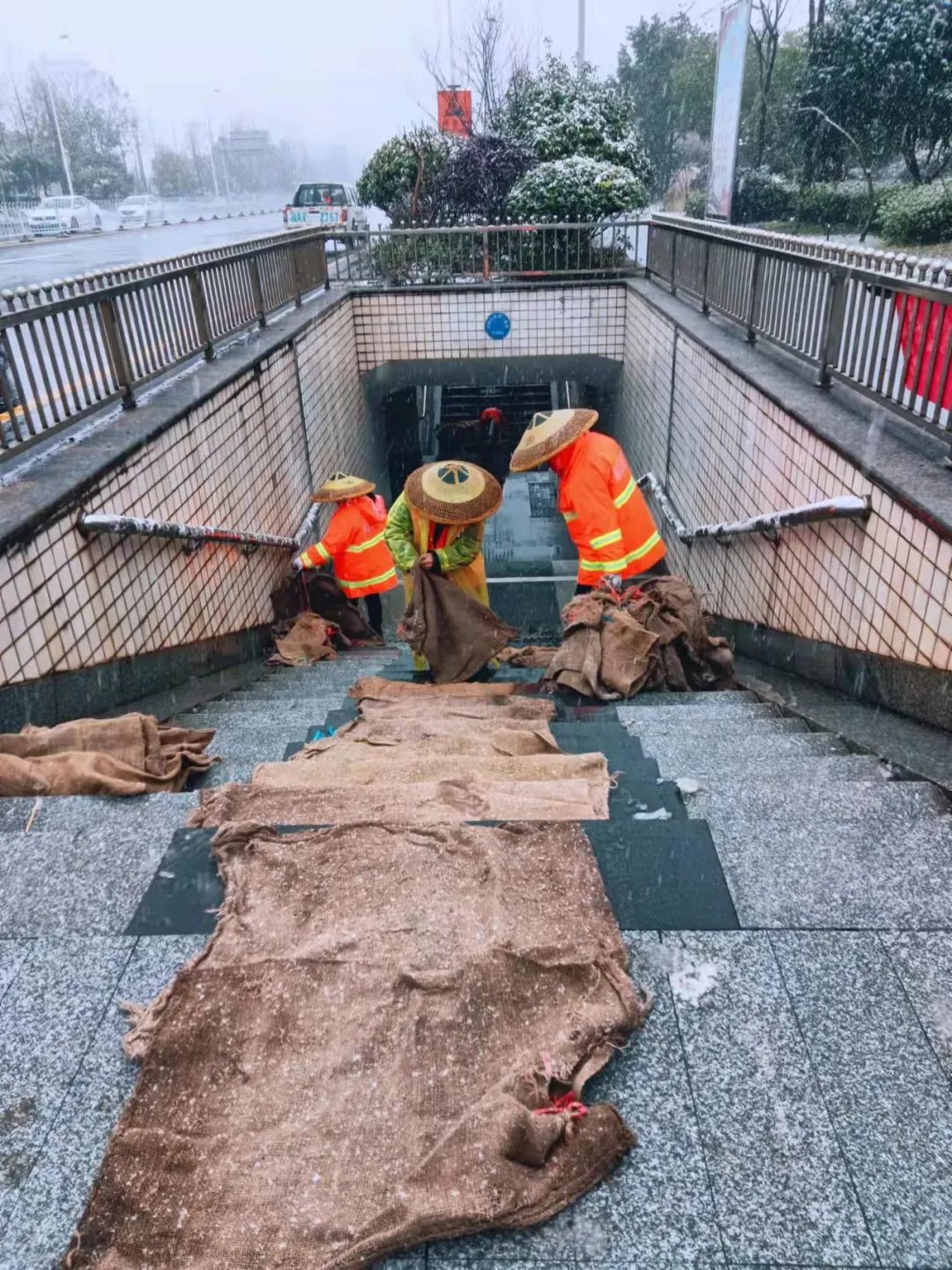 2月22日,岳麓区岳麓街道组织各村社区、物业公司开展雨雪天气扫雪除冰行动,在小区出入口铺设麻袋、撒工业盐、张贴安全出行提示。