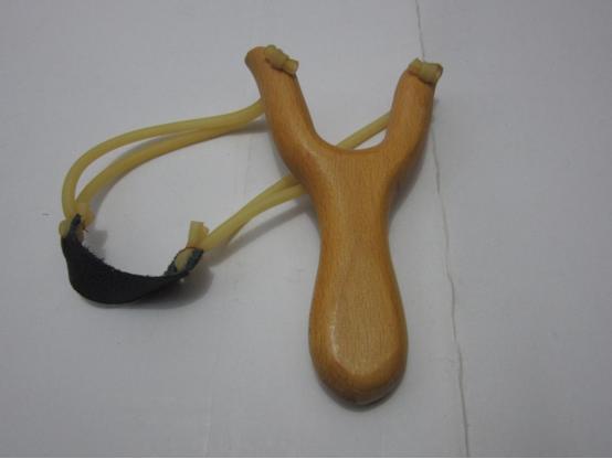 弹弓的制作很简单,只要有支架(把手)、橡皮、捏手皮三样材料。支架一般选用粗细合适的树丫,最好用榆树、桑树等材质坚硬的树枝,做成“Y”形的支架,也有用粗钢丝制成的;橡皮可用汽车轮胎的内胎裁剪而成,也可以用上好的橡皮筋双根串接制成,不过我最喜欢用乳胶管,拉力足、弹性好,制作方便;捏手皮最好选用牛皮或猪、羊皮。我曾先后做过好几把弹弓。本世纪初在井冈山景点看到有弹弓销售,我买了一把做纪念,不过觉得还没有自己做的好用。