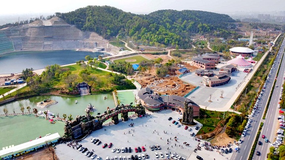 我现在是在马鞍山市当涂县大青山野生动物世界,从我现在所在的这个观景平台看下去,底下的花山瑶池项目一池碧水如同一颗翡翠,包含着滑道漂流、高空滑索等十几个游玩项目,更加特别的是,它是由一个废弃的矿坑改造而成的,是一座特别的矿坑公园。