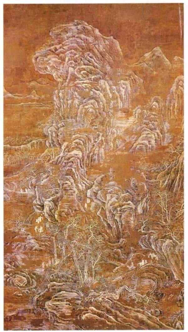 该画设色浓重,画法以秃笔细写,整幅画面画家以墨取韵,用细笔勾勒出山体的形态结构,表现出山的阳刚之美,再用墨渲染则表现出山的仪姿,体现出了山脉的阴柔之美。相传该画是从古墓中出土的。