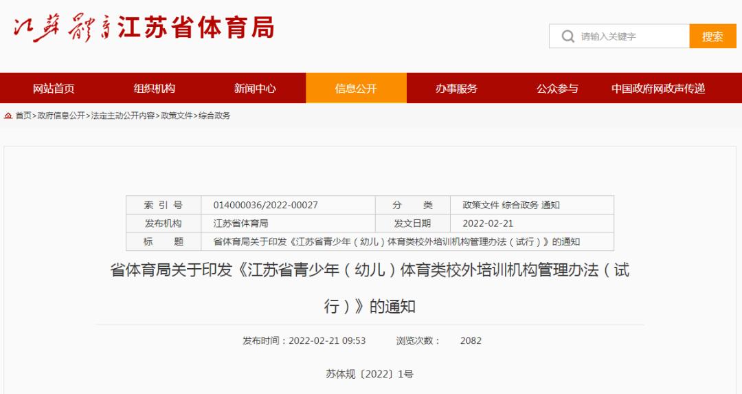 近日,江苏省体育局近日印发《江苏省青少年(幼儿)体育类校外培训机构管理办法(试行)》(以下简称“办法”),加强学龄前、义务教育阶段和高中阶段体育类校外培训机构的服务监管工作。