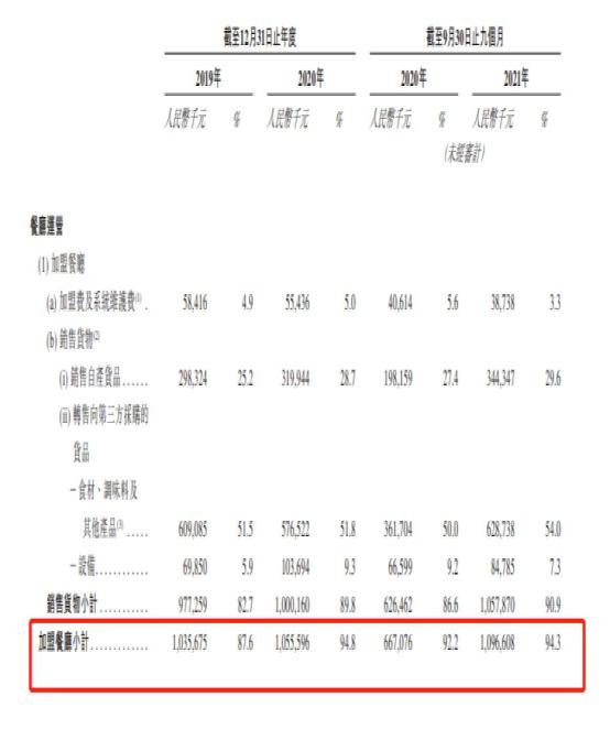 具体来看,2019年加盟餐厅年度收入占总收入的比例为87.6%,到2020年上升至94.8%。截至2021年9月30日,加盟餐厅年度收入占比仍超94%。自营餐厅收入占比则逐步下降,2019年占比为1.4%,到2020年下降至0.7%,截至2021年9月30日占比进一步减少至0.5%。