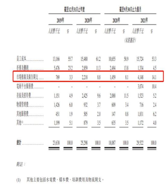 销售开支明细方面,杨国福近年来在市场推广和广告开支上有所增加。招股书显示,2019年相关支出为76.9万元,占总比为3.3%;到2020年上涨至221.8万元,占总比为8.8%;截至2021年9月30日,相关支出为414.8万元,占总比为14.1%。