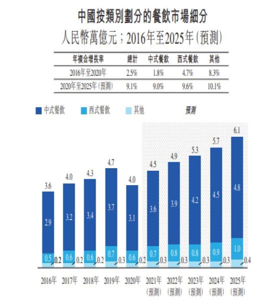 弗若斯特沙利文数据显示,按商品交易总额的总和计算,中国餐饮市场的市场规模持续稳定增长,预期到 2025年将增长至的约人民币61,000亿元,2020年至2025年的年复合增长率为9.1%。其中,中式餐饮市场则是中国餐饮市场的主要分部。市场规模将于2025年达约人民币48,000亿元,2020年至2025年的年复合增长率约为9.0%。