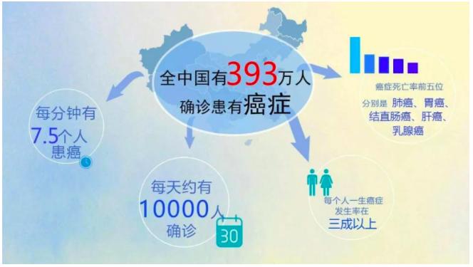 根据2019中国国家癌肿中心发布的最新一期的全国癌症统计数据。报告显示,2015年全国恶性肿瘤发病约392.9万人,较2014年380.4万增加12.5万,增长率为3.2%。这就意味着,平均每天超过1万人被确诊为癌症,每分钟7.5人被确认为癌症。