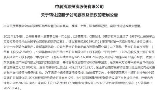 1月29日,中润资源发布《关于转让控股子公司股权及债权的进展公告》,公司拟将持有平武中金76%股权及全资子公司中润矿业持有的平武中金1.45亿元债权全部转让给紫金矿业南方投资。