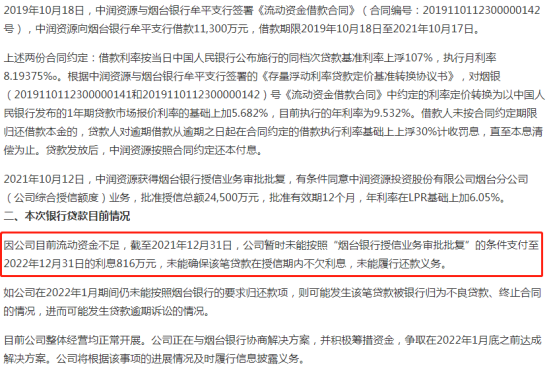 但中润资源坦言,公司目前流动资金不足,截至2021年12月31日,公司暂时未能按照“烟台银行授信业务审批批复”的条件支付至2022年12月31日的利息816万元。如中润资源在2022年1月期间仍未能按照烟台银行的要求归还款项,则可能发生贷款逾期诉讼的情况。