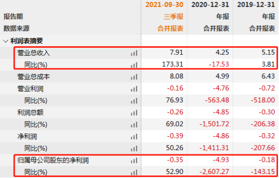 值得注意的是,2021年前三季度,中润资源实现营业总收入7.91亿元,同比增加173.31%;归母净利润-0.35亿元,同比增加52.90%。而2019年和2020年一整年,中润资源归母净利润分别为-0.18亿元和-4.86亿元,同比增速分别为-143.15%和-2607.27%,近三年来持续亏损近5.5亿元。
