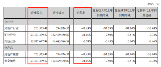 另外,2021年半年报显示,中润资源2021年上半年房地产销售业务营业收入仅为20.56万元,矿业部分收入1.94亿元,其他业务收入0.14亿元,黄金及其他业务占比较大。中润资源的收入大多靠矿业和其他业务获得,而房地产销售业务毛利率为-43.43%。