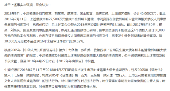 此3亿元借款本金占2016年末经审计净资产的20.32%,但中润资源未对上述事项及时予以披露,直至2018年4月27日才在《2017年年度报告》中披露,且在2016年7月11日至2018年4月27日期间多次发生未及时披露重大债务逾期行为,已构成违法行为。故中国证监会拟决定对中润资源及相关责任人给予警告,并各处以罚款。