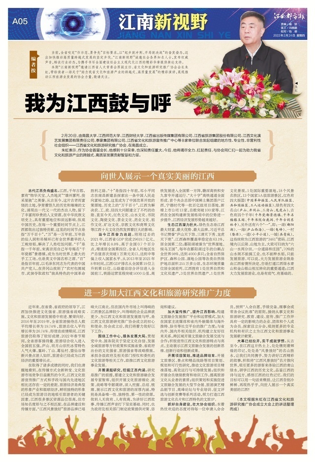本期“江南新视野”邀请江西省人大常委会原副主任、省文化和旅游研究推广协会会长朱虹,带给读者一场关于“助力我省文化和旅游产业的跨越式、高质量发展”的精彩演讲,展现推动江西旅游业发展的协会力量。敬请关注。