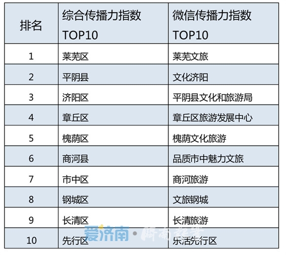 基于对微信传播力指数、微博传播力指数、头条号传播力指数和抖音号传播力指数的综合评价,记者了解到,2022年1月济南市县级文化和旅游部门新媒体的综合传播力排名前10为:莱芜区、平阴县、济阳区、章丘区、槐荫区、商河县、市中区、钢城区、长清区、先行区。其中,莱芜区获得综合传播力榜首。在微信传播力指数排名中,“莱芜文旅”也拔得头名。