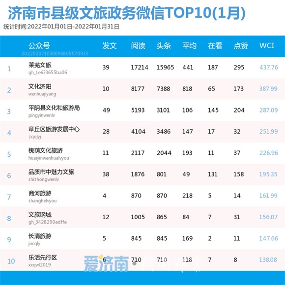 根据整体传播力、篇均传播力、头条传播力、峰值传播力的综合评价,2022年1月济南市县级文旅部门微信公众号传播力排名前10位为莱芜文旅、文化济阳、平阴县文化和旅游局、章丘区旅游发展中心、槐荫文化旅游、品质市中魅力文旅、商河旅游、文旅钢城、长清旅游、乐活先行区。