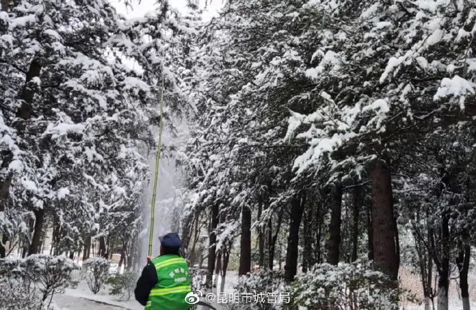 “降雪阻碍了车辆、行人的正常通行,也把冠幅开阔的树枝压弯了腰,摇摇欲坠的树枝隐藏着巨大的安全隐患。”晋宁区城管局相关负责人介绍,为避免安全事故发生,当天已将前期成立的应急队伍分成4个小组,一组人员用竹竿对城区郑和路、昆阳街等路段积雪严重的行道树开展积雪清除工作;一组人员劝离行道树下逗留的老人和小孩,以免发生安全事故;一组人员对城区超市商场、公厕周边、主要交通干道开展铲雪、防冰、控水工作;最后一组人员对城区各道路、公园、广场进行全面排查,发现问题及时处理。