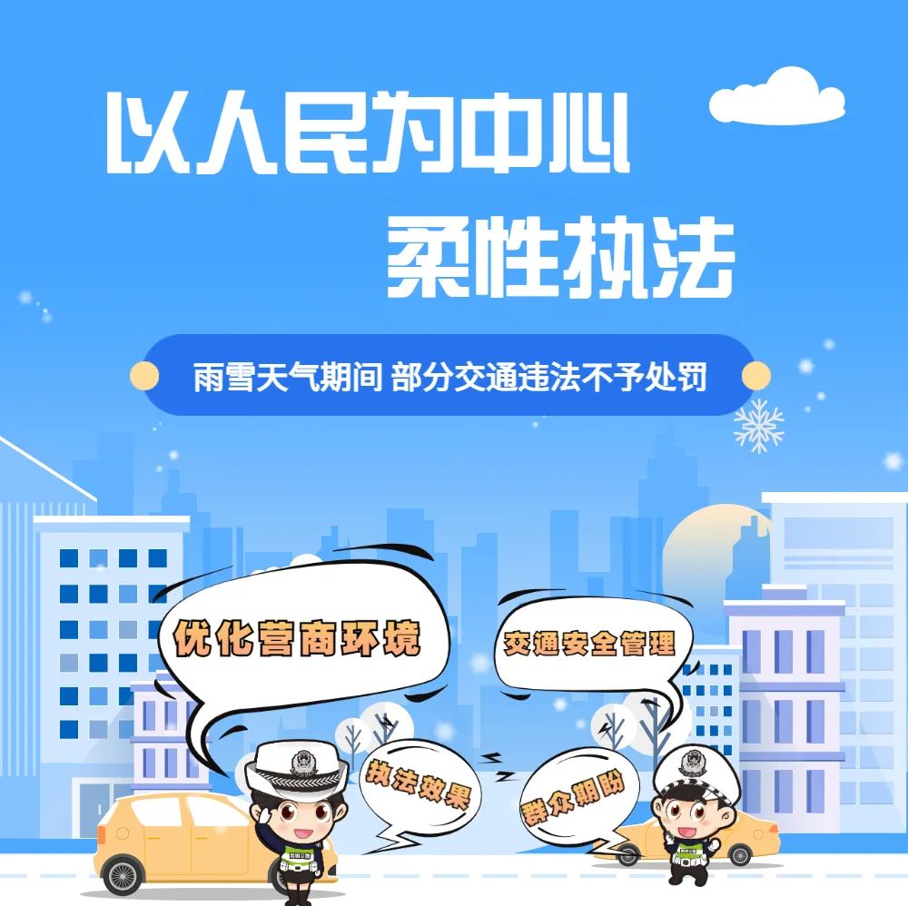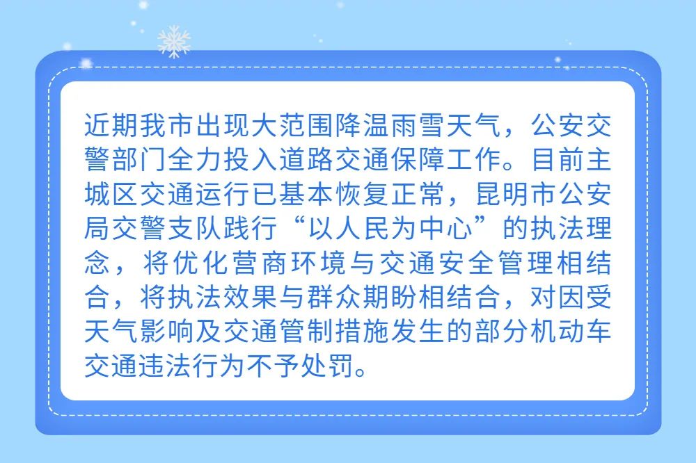 昆明市公安局交警支队结合近期交通道路交通运行情况,在全市范围内推出雨雪天气交通违法行为柔性执法措施,为群众出行提供便利。