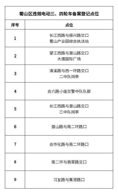 ▲蜀山区违规电动三、四轮车备案登记点位。