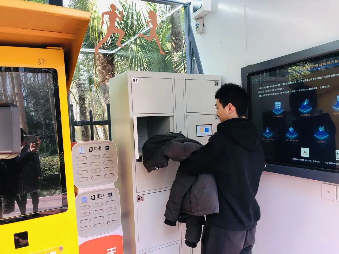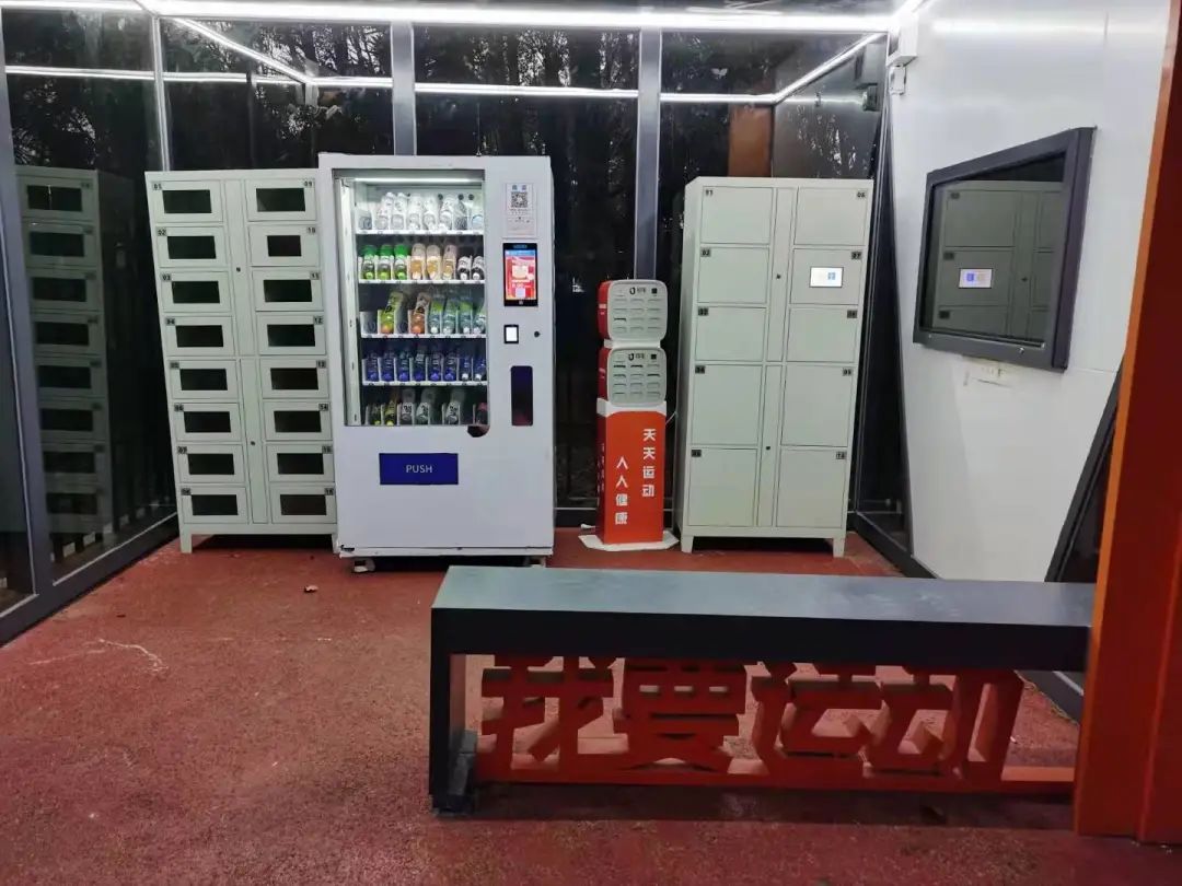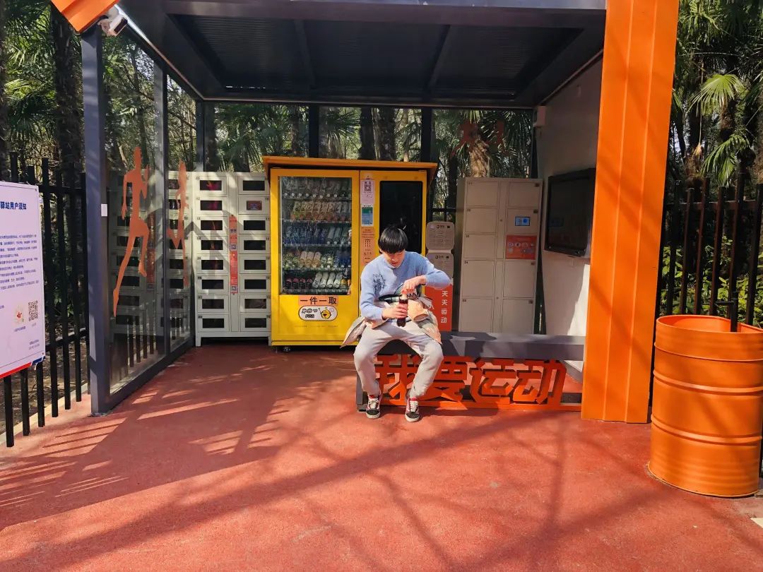 运动驿站内,设置了储物柜、饮料售卖机、充电宝租赁、休息座椅等设施,不时有跑步健身的市民,走进来买瓶水、储存一下衣物,或是坐下休息。