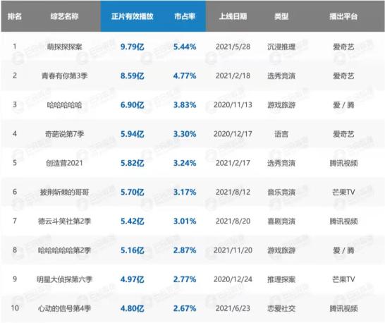 根据云合数据显示,2021网络综艺有效霸屏榜中,《萌探探探案》《青春有你3》《哈哈哈哈哈》《奇葩说7》和《创造营2021》排在前五位。在电视综艺方面,《王牌对王牌6》《奔跑吧5》《极限挑战7》等老牌综N代依然排在前列,只是播放量较2020年都有所下降。