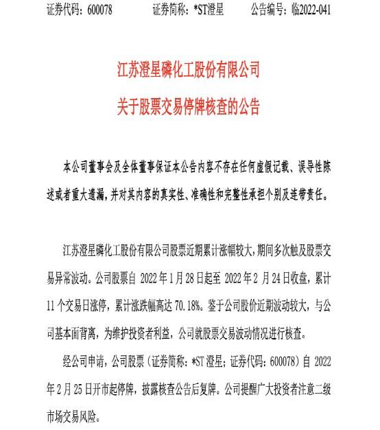 公告表示,*ST澄星股票近期累计涨幅较大,期间多次触及股票交易异常波动。公司股票自 2022年1月28日起至 2022年2 月24日收盘,累计11个交易日涨停,累计涨跌幅高达70.18%。鉴于公司股价近期波动较大,与公司基本面背离,为维护投资者利益,公司就股票交易波动情况进行核查。