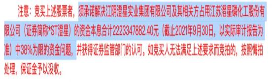 澄星集团持有的*ST澄星股权第二次拍卖起拍价约为4亿元,市场价7.14亿元,保证金5000万。虽然起拍价远低于市场价,但需要注意的是,竞买者须承诺解决澄星集团及其相关方占用公司的资金本息合计22.23亿元中62%为限的资金问题。汉盈投资持有的*ST澄星股权变卖价约为4亿元,竞买人须承诺解决22.23亿元中38%为限的资金问题,即8.45亿元。