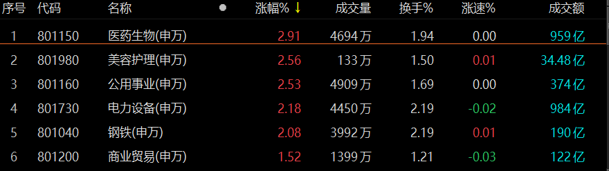 从盘面上看,今日医药股全天强势,迎来大爆发。在31个申万一级行业中,医药生物以2.91%的涨幅位列涨幅榜榜首。另外,美容护理、公用事业、电力设备、钢铁涨幅均超2%,位列涨幅前列。
