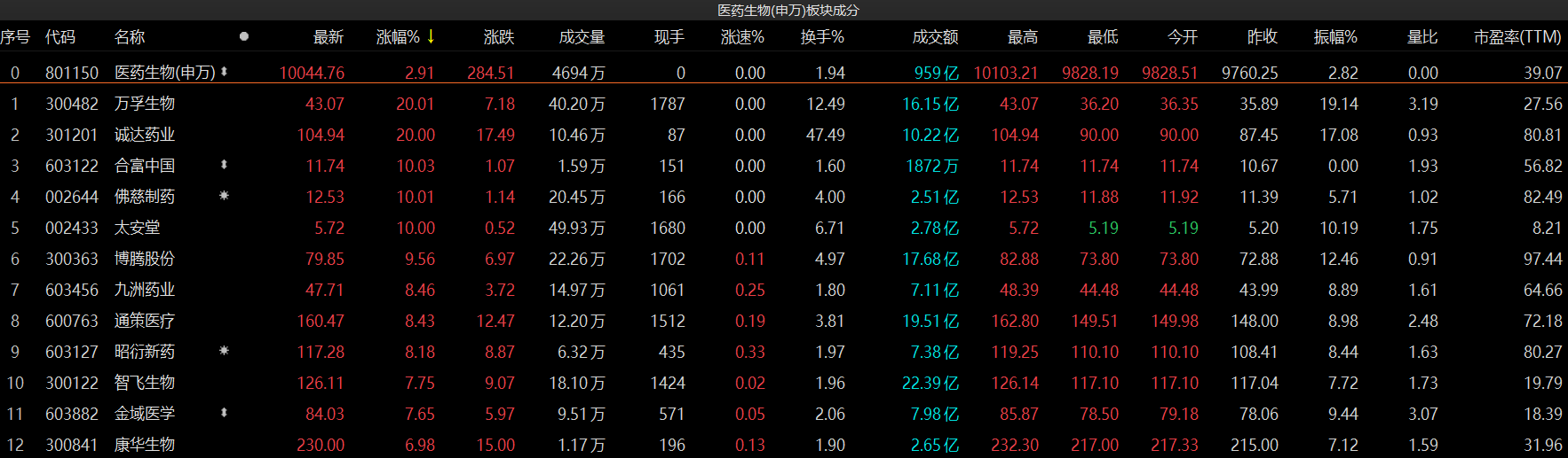 在相关个股方面,万孚生物、诚达药业封上20CM涨停板,合富中国、佛慈制药、太安堂则10CM涨停。此外,博腾股份、九洲药业、通策医疗、昭衍新药涨幅均超8%,智飞生物、金域医学等多股处于涨幅前列。