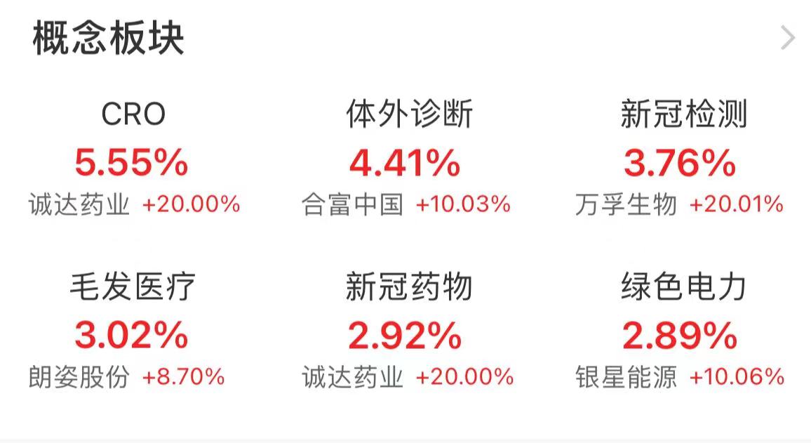 在概念板块方面,与医药板块相关的CRO、体外诊断、新冠检测、毛发医疗、新冠药物稳居涨幅榜前五。