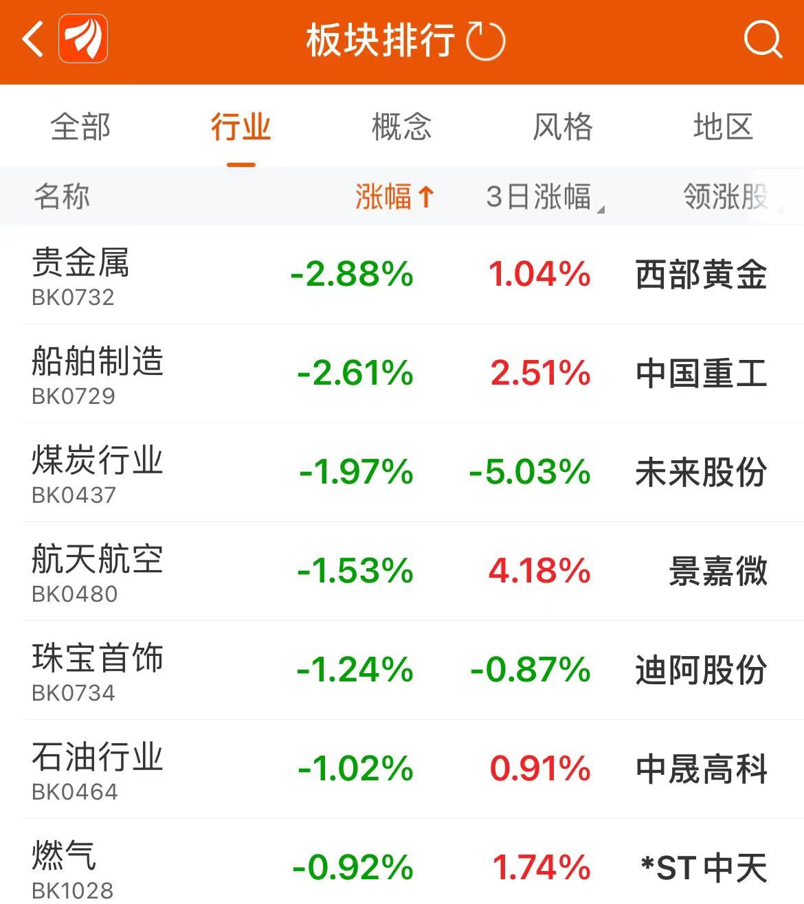从盘面上看,贵金属、军工、煤炭、石油石化等板块处于跌幅前列。具体来看,贵金属板块以2.88%的跌幅居于跌幅榜榜首,船舶制造、煤炭行业、航天航空、珠宝首饰、石油行业等行业板块跌幅均超1%。
